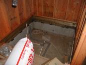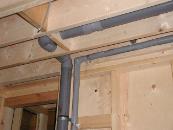 2001:10:08 20:14:38 手前の太いパイプは二階のトイレの排泄物を流すための菅だそうです。本当はまっすぐ下げる予定だったですが、うまく取り回しができないということで変更になりました。こういう突然の変更は結構多かったです。 |