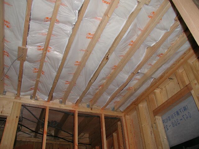 天井には断熱材(グラスウール)が入れられてます。業者が言うには、防音のためだそうです。断熱のために壁に入れるのはロックウールだそうです。
