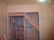 2001:10:31 19:07:11 階段が作られてます。写真中央の縦の細い木は、おそらく踊り場が落ちないようにを支えているんだと思いますが、ずいぶん細い気がしますね。そのせいか踊り場に乗るとミシっと音がします。大丈夫でしょうか。 |