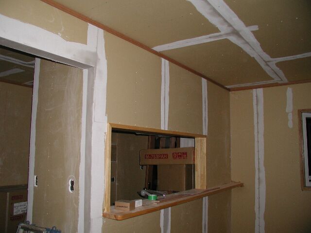 2001:11:08 19:00:31 石膏ボードのつなぎ目をパテで埋めてます。クロスをきれいに貼るためには欠かせない行程です。
