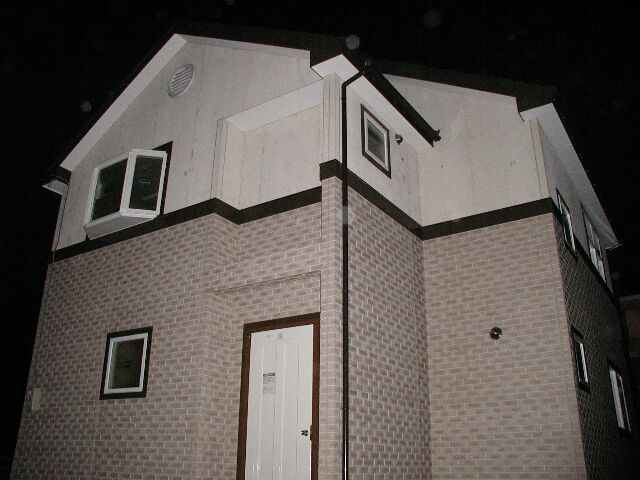 2001:11:08 19:12:31 足場がはずれ、家の外観が姿を現しました。感動です。玄関ドアが仮ドアのままなのが残念ですが。