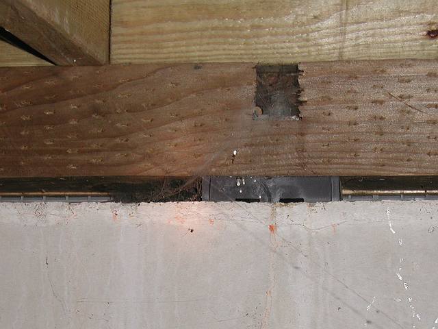 土台の材木に空いている穴は、アンカーボルトが顔を出すために空けられたものです。でも本来は上から見た場合、材木の真ん中に空けることになっているものなので横から見えてはいけないんですけどね。またさすがに5年目にもなってクモの巣が張っています。
