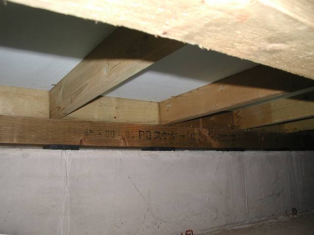 根太が2本と床板の下に貼られたスタイロエースと言う商品名の断熱材が見えています。基礎のコンクリートにはクモの巣がちょっと見えますね。